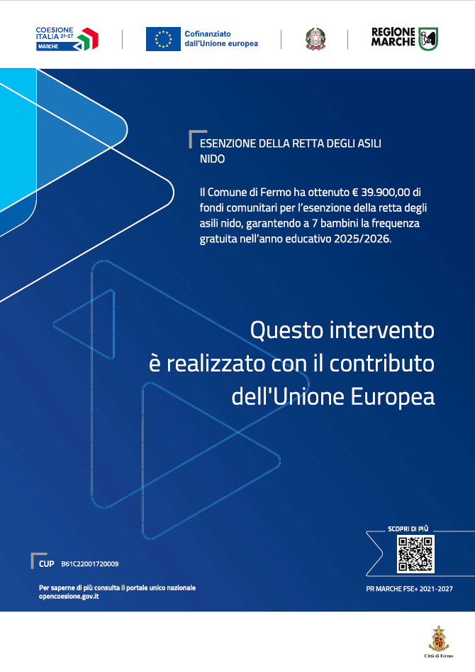 Il Comune di Fermo è stato ammesso al bando regionale per l’esonero totale per 7 bambini della retta di frequenza per il servizio Nido d'Infanzia Comunale "Mario Santoro" per l'anno educativo 2025/2026. L'iniziativa è specificamente rivolta alle famiglie con un reddito Isee inferiore ad euro 10.000,00. Per ogni bambino beneficiario, la Regione Marche, attraverso risorse di fondi comunitari del PR FSE+ 2021/2027, erogherà all’Ente un contributo forfettario di € 5.700,00, destinato a coprire interamente i costi della retta senza alcun onere per le famiglie coinvolte. Si tratta di un sostegno concreto che mira a favorire l'accesso ai servizi educativi e a sostenere le famiglie nella conciliazione tra vita privata e lavorativa, con particolare attenzione ai nuclei più fragili e alla componente femminile della famiglia, spesso maggiormente coinvolta nel lavoro di cura dei figli. Questo progetto che prevede un riconoscimento di € 39.900,00, consente dunque di ridurre le disuguaglianze, sostenere la genitorialità e di offrire ai bambini opportunità educative di qualità fin dai primi anni di vita.