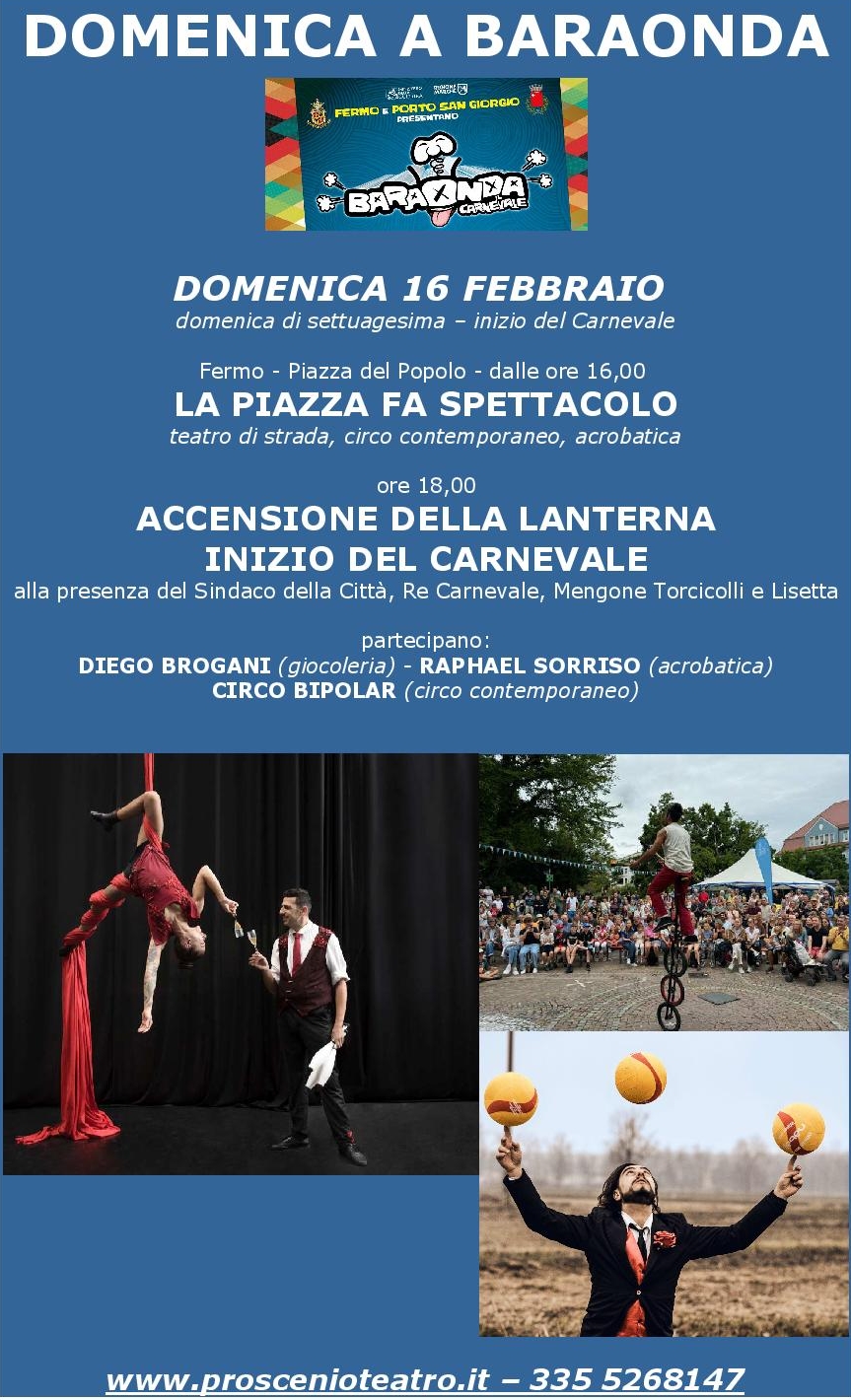 Domenica 16 febbraio 2025 segna nel calendario l'inizio ufficiale del periodo di Carnevale e quindi anche di BARAONDA, il Carnevale di Fermo e Porto San Giorgio promosso dai Comuni di Fermo e Porto San Giorgio, con la direzione artistica di Marco Renzi ed il coordinamento di Proscenio Teatro, che da nove anni propone un cartellone unico tra i due Comuni e che mette insieme le trentasei edizioni del Carnevale a Fermo con le ventotto del Carnevale a Porto San Giorgio.